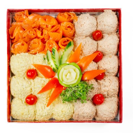 A decadent platter featuring the perfect combination of fresh tuna, creamy egg, luxurious lox, and smooth cream cheese. Served with carefully selected accompaniments, this dish offers a satisfying balance of flavors and textures, ideal for a rich and fulfilling meal.